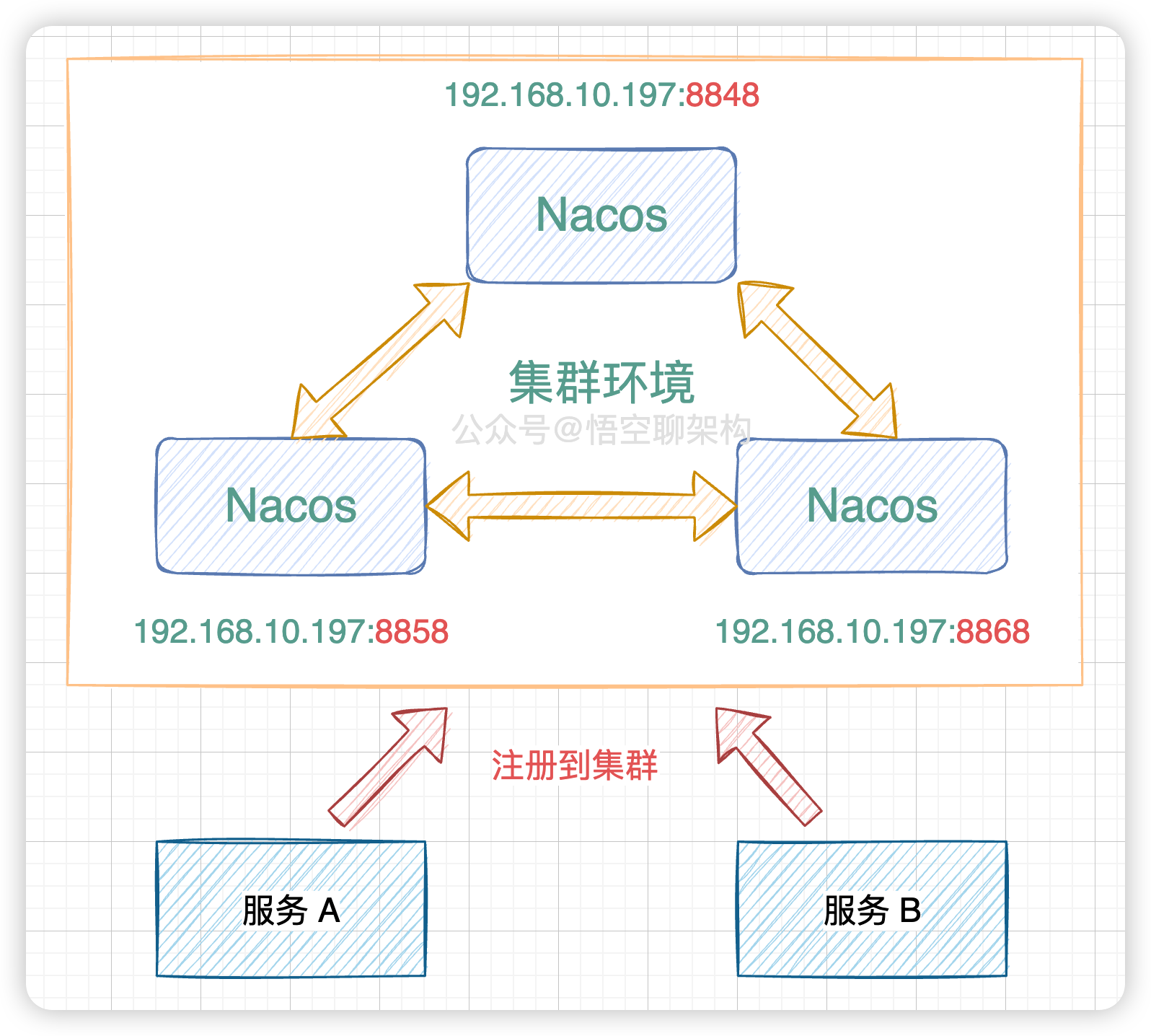 整体的结构如下图所示,服务 A 和 服务 B 都往 Nacos 集群进行注册。