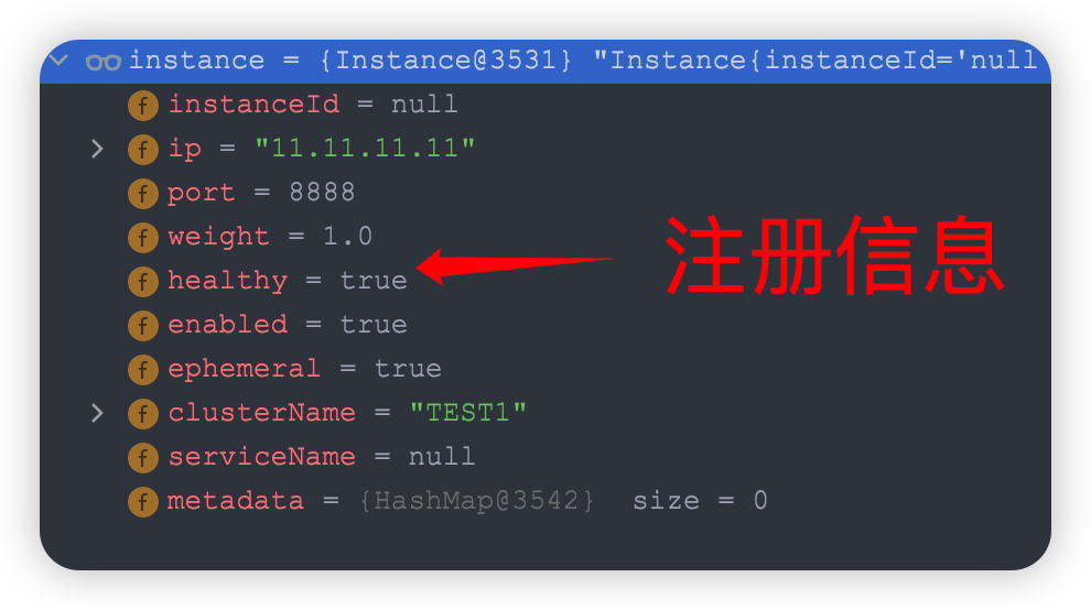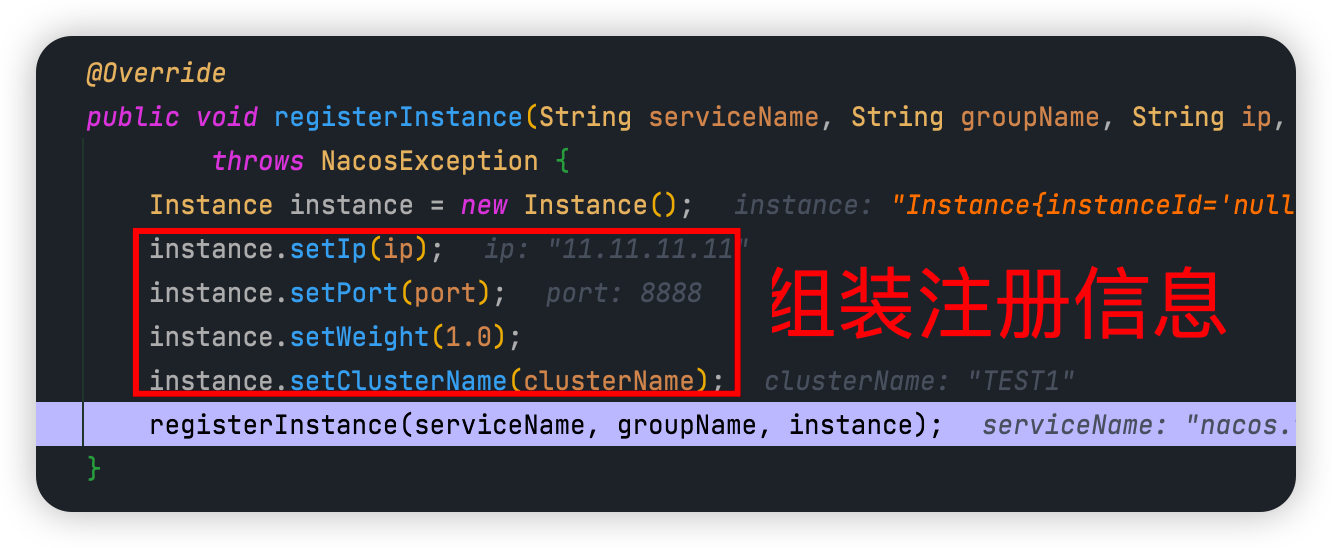 入口的核心代码如下图所示,它会组装注册的实例信息,放到一个 instance 变量里面: