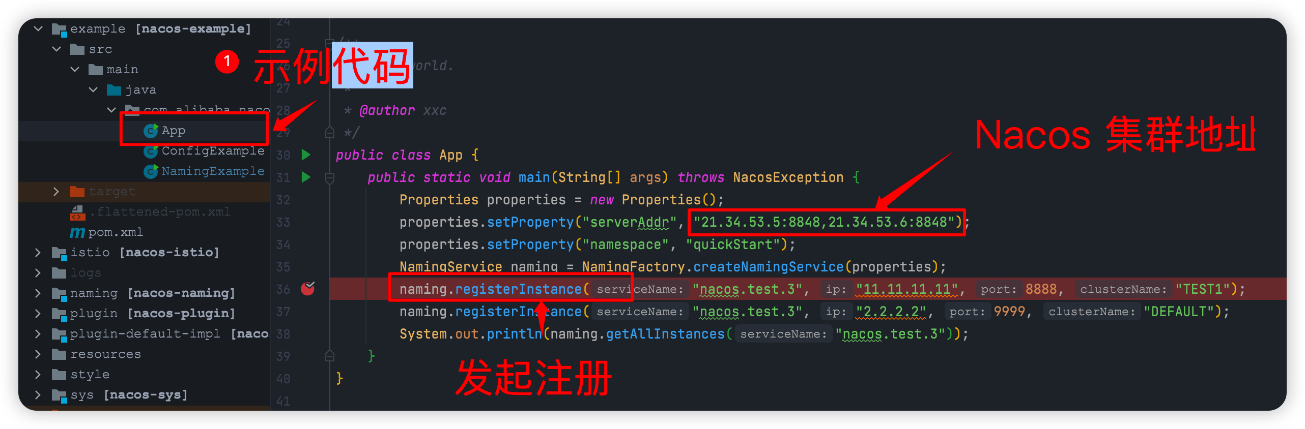 告诉大家一个看源码的小技巧,拿到源码后,不是直接各个文件都看一篇,而是先看源码中带的 example 文件夹。如下图所示,找到 example 的 App 类,里面就有发起注册的实例代码。如下图所示: