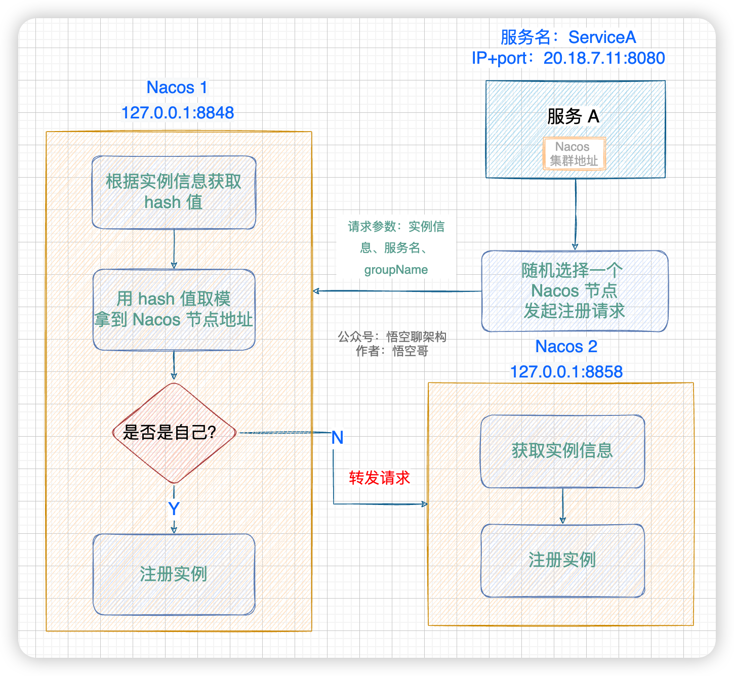 服务 A 随机选择一个 Nacos 节点(图中为 Nacos1)发起注册请求,请求参数中包含了实例信息,Nacos 1 根据实例信息 hash + 取模拿到正确的节点,如果不属于自己,则将请求转发给其他节点(图中为 Nacos2)