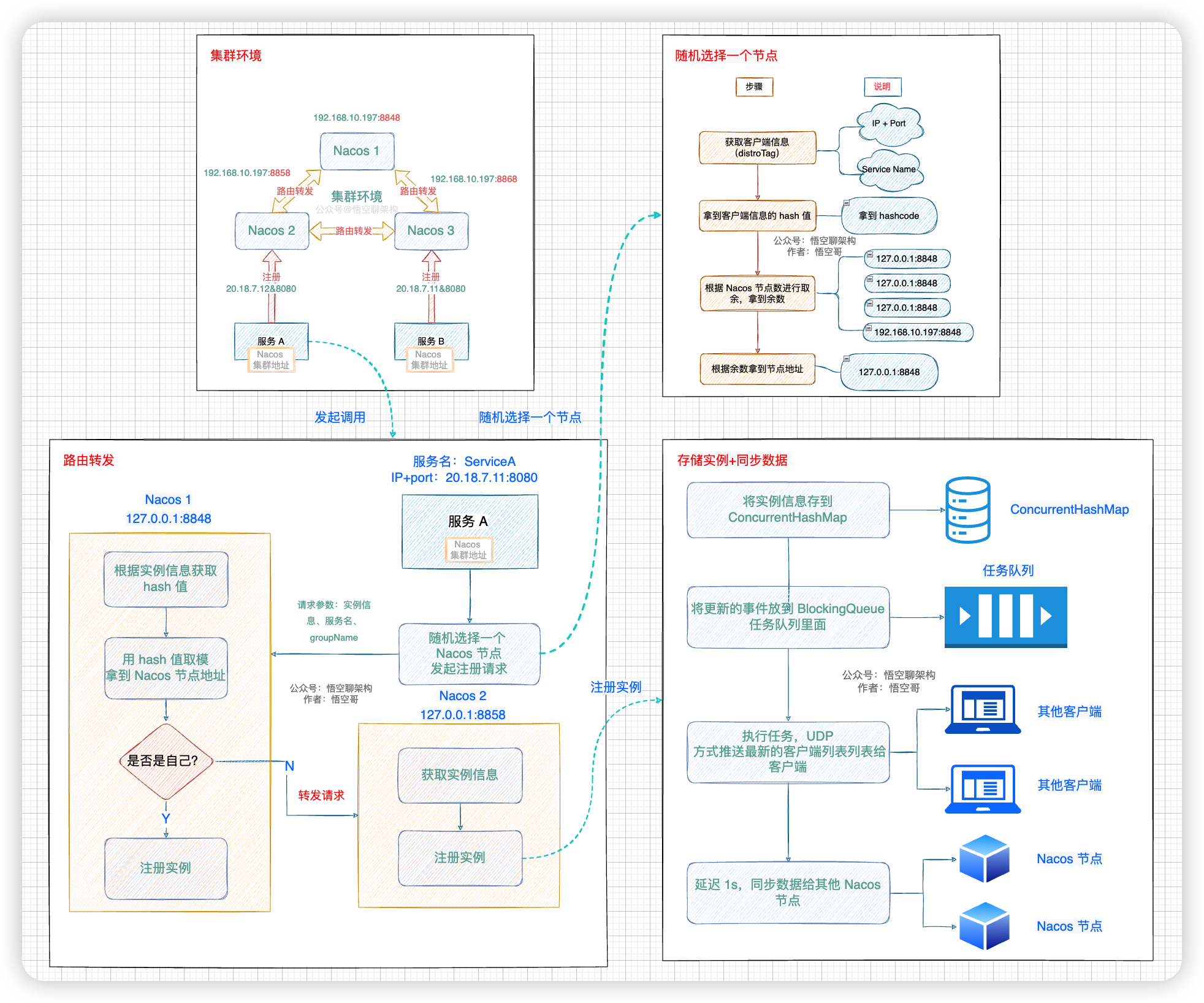本文通过发起一条注册请求,讲解了 Nacos 客户端如何随机选择节点、Nacos Server 如何路由、Nacos Server 如何存储注册实例。