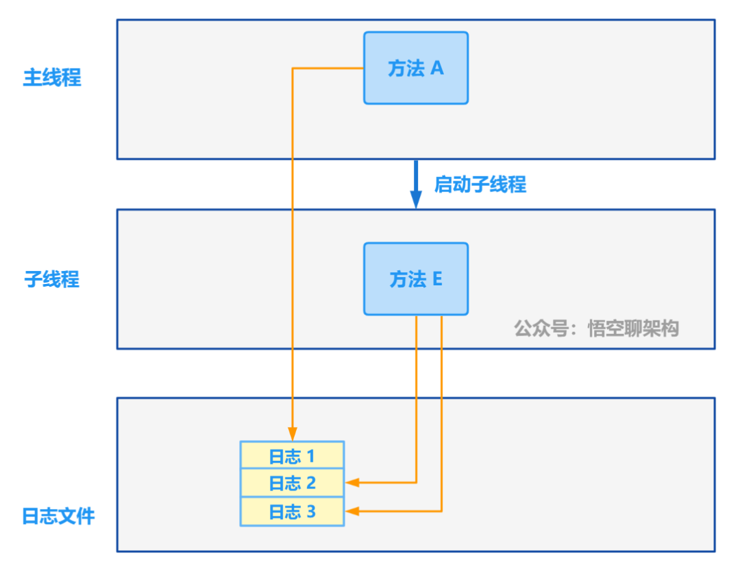如下图所示:主线程的方法 A 启动了一个子线程,子线程执行方法 E。