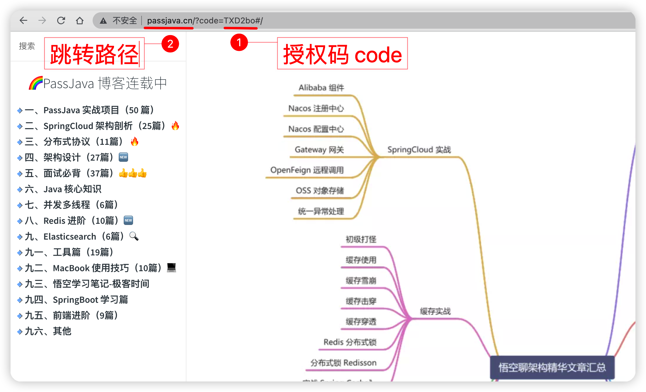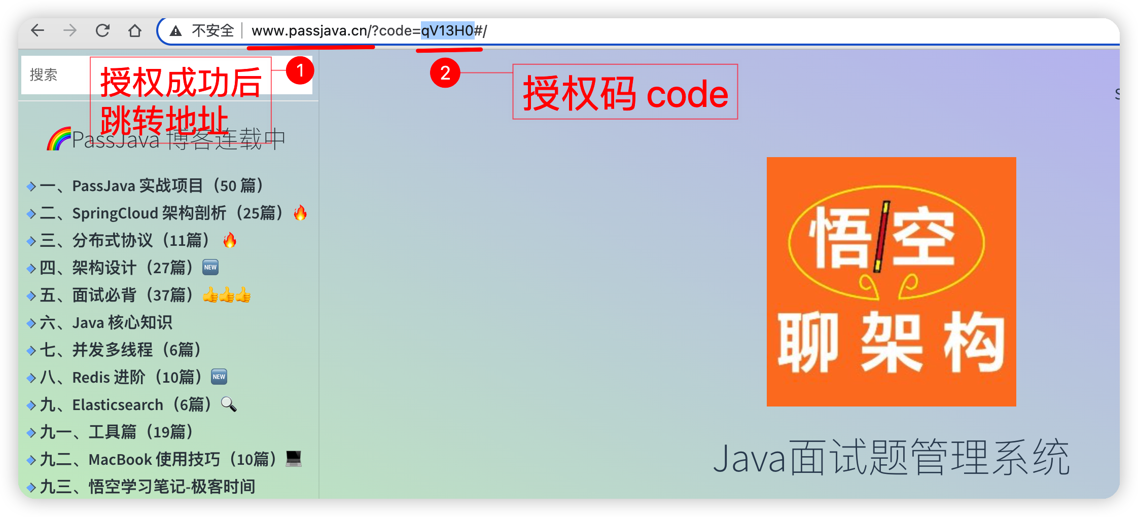 点击授权页面下方的 Authorize 按钮,将会跳转到 http://www.passjava.cn,这个网址 url 后面还会携带一个 code 参数,值为 qV13H0,它是后端 OAuth2.0 授权服务器返回的,把这个值拷贝出来,待会我们用它来换取 token。