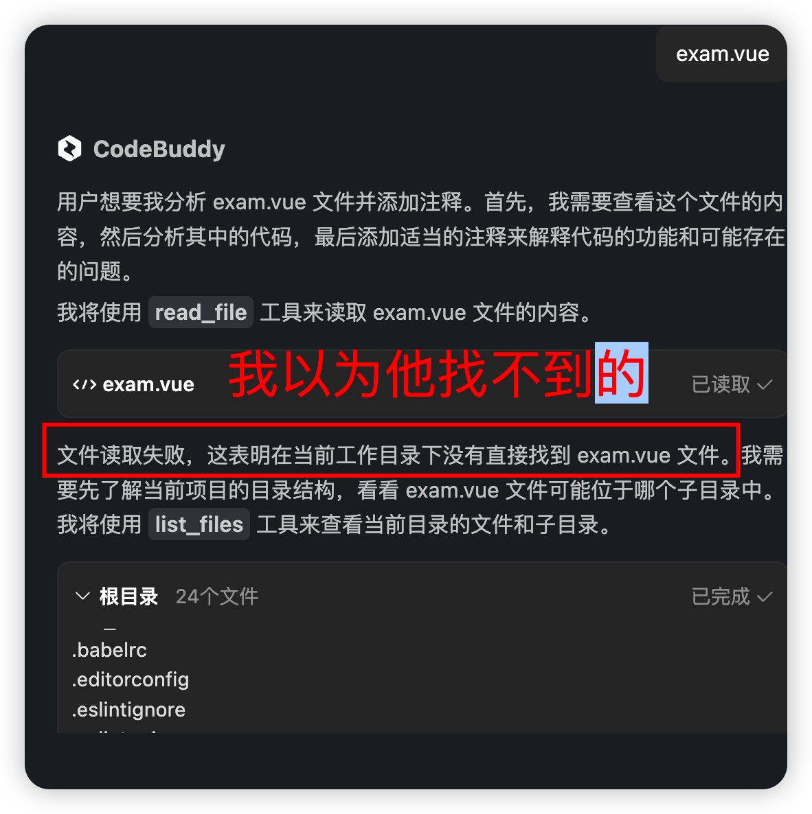 CodeBuddy 还会用 read_file 工具来读取 exam.vue 文件,然后告诉我读取失败,我以为这就完了,没想到它还是遍历整个文件工程,太炫酷了!