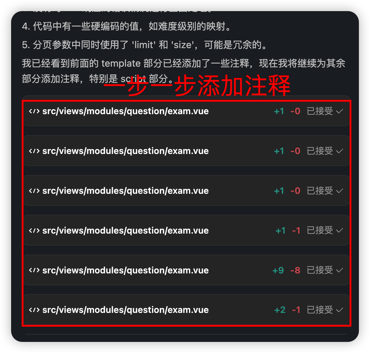 CodeBuddy 就会自动一步步添加注释。如下图所示: