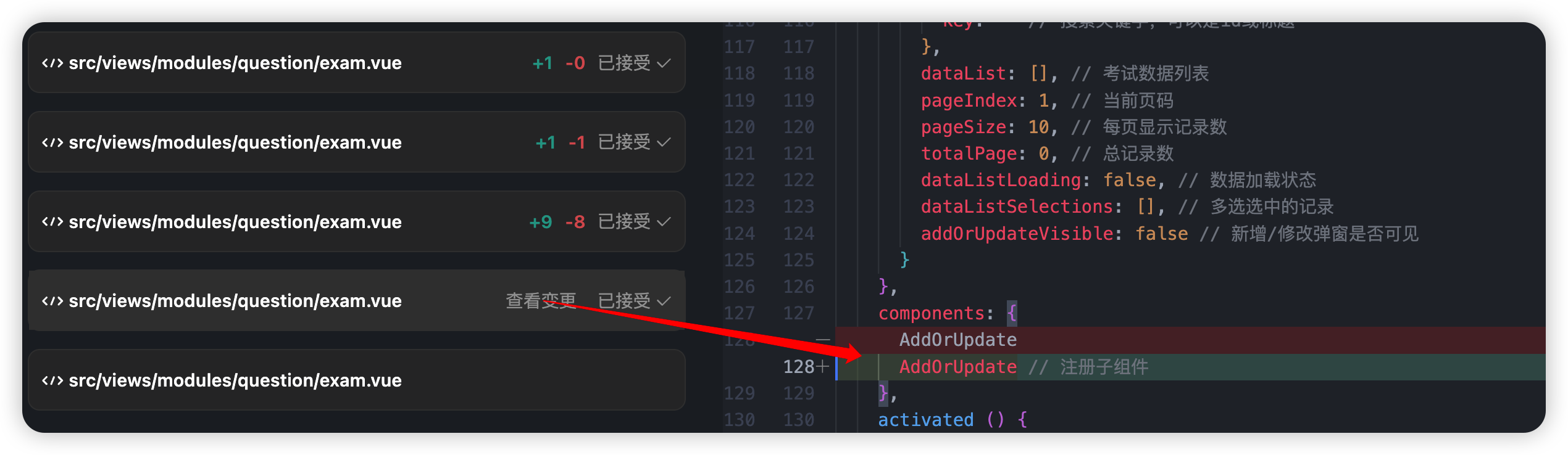 经过5次遍历查找,终于找到了 exam.vue 文件。如下图所示: