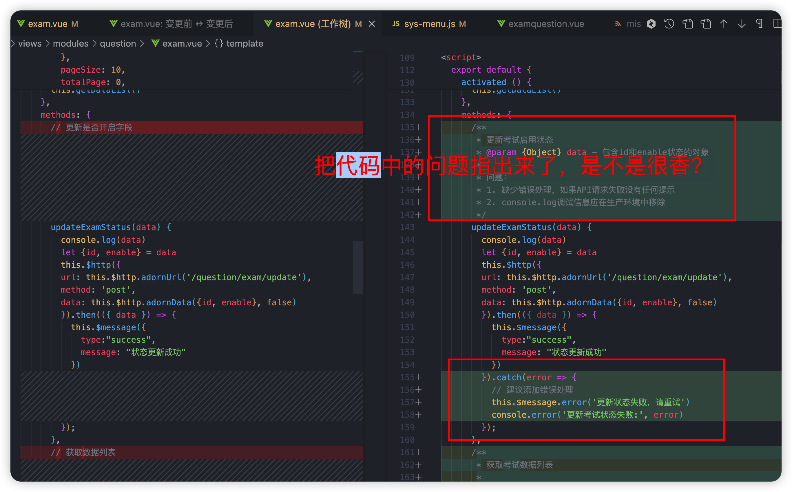CodeBuddy 开始分析 exam.vue 文件中的问题。