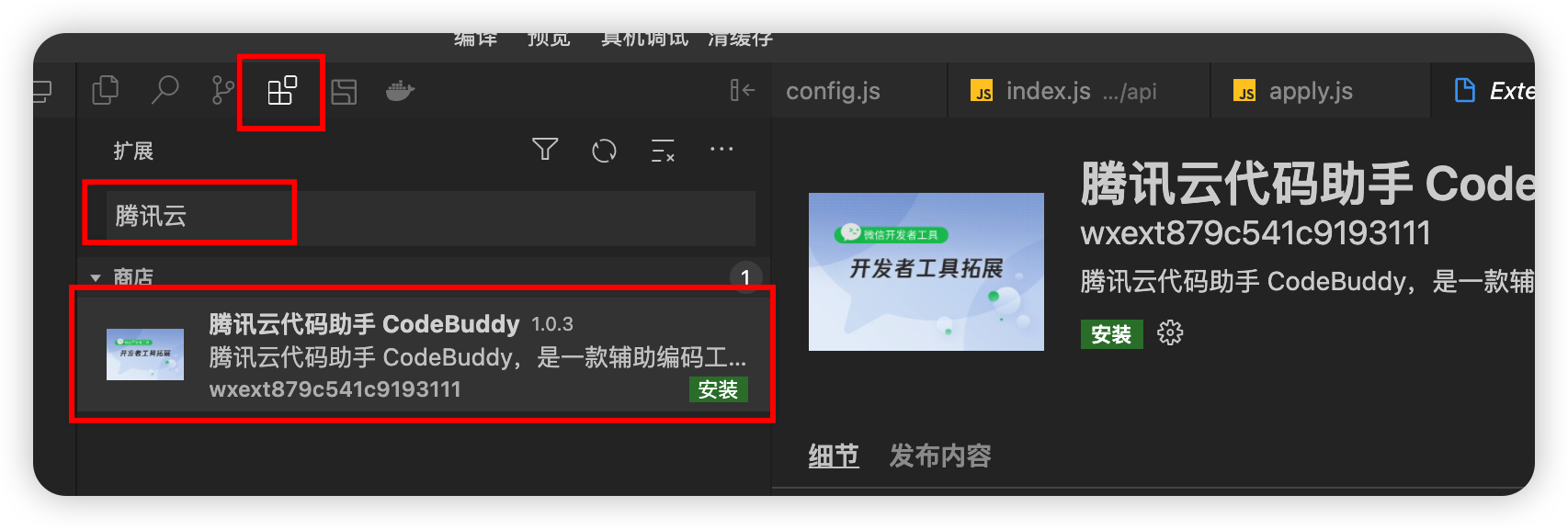 微信开发者工具已经支持安装插件了,我们在插件市场搜索腾讯云代码助手,就能看到 CodeBuddy 插件了,点击安装,就能直接使用了。