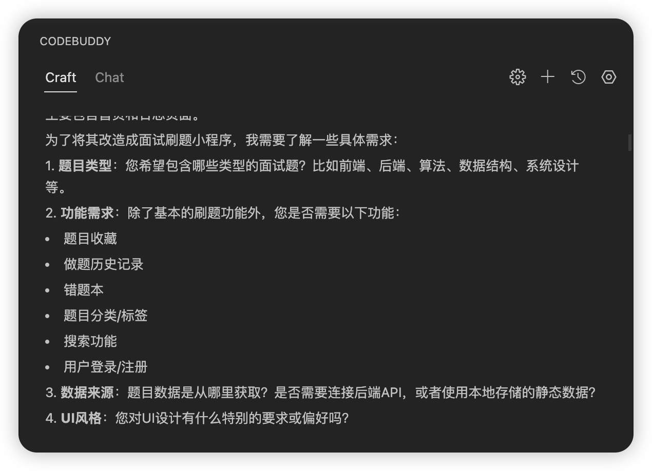 首先 CodeBuddy 会读取根目录的文件,然后会提示我这个需求太简单了,还需要加一些需求它才能继续干活。比如哪些面试题,包含哪些功能,比如题目收藏,错题本,还有数据来源是从后端获取还是小程序本地存储的静态数据,最后是 UI 风格是什么样的。如下图所示: