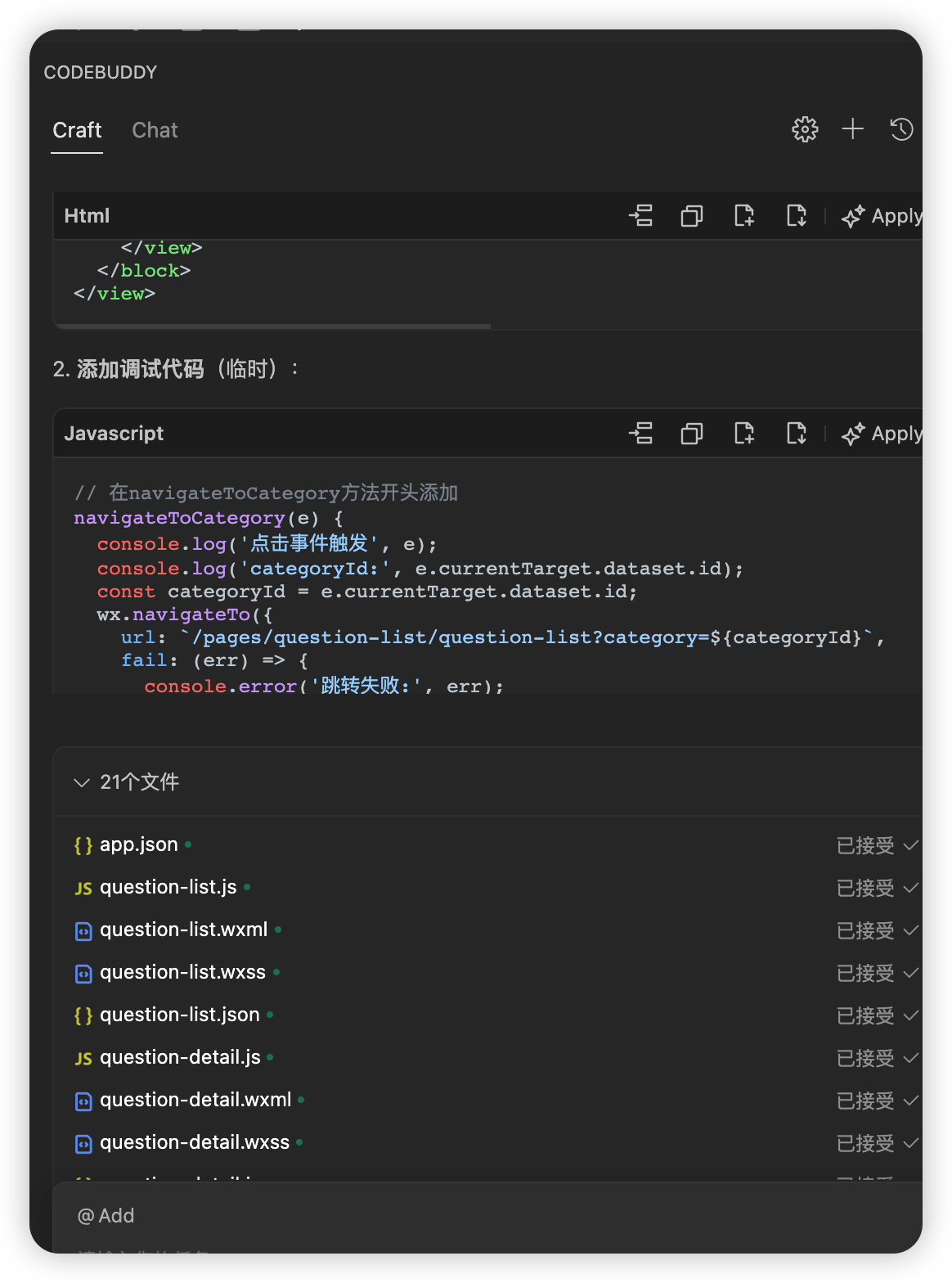如下图所示:CodeBuddy 会尝试将上面的模版小程序改写成一个面试刷题小程序。