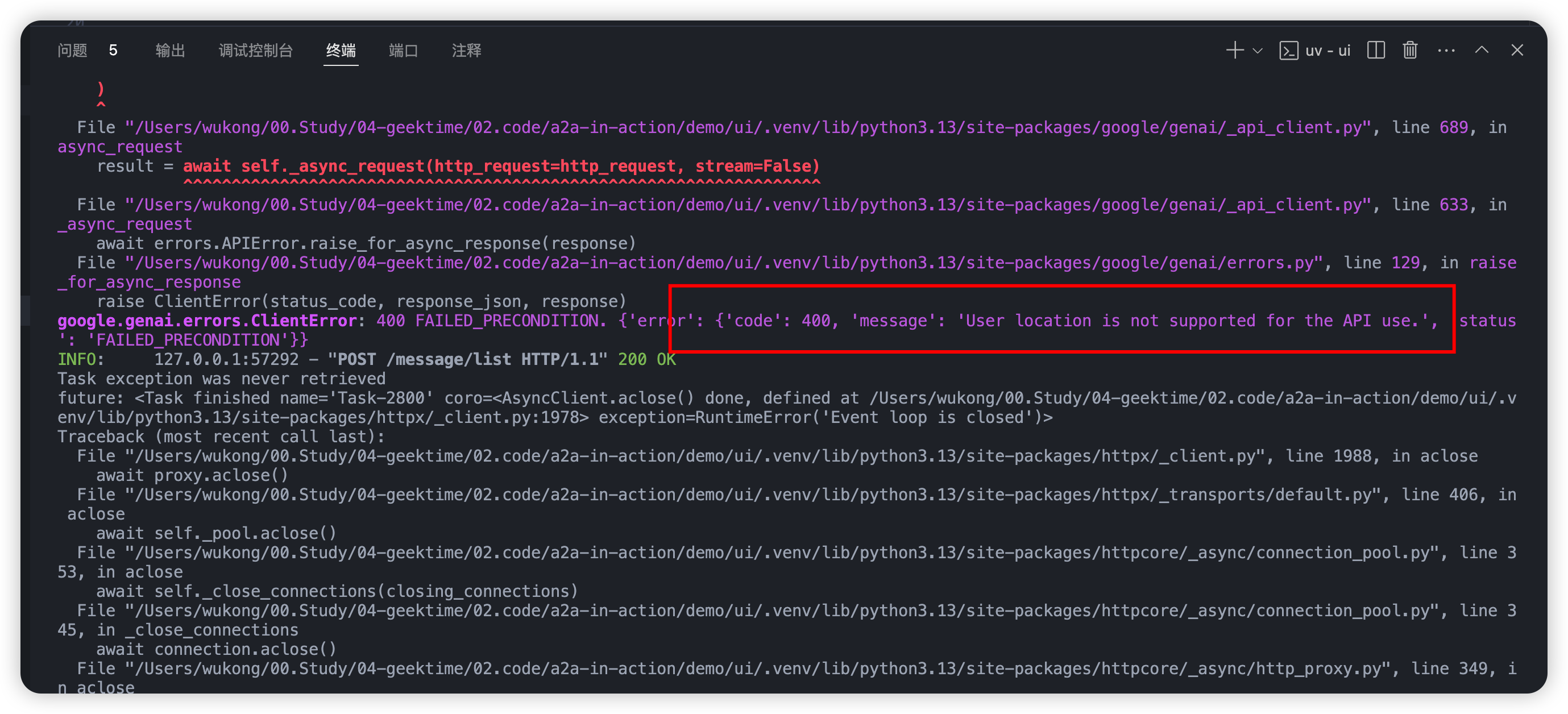 学习极客时间 MCP 和 A2A 协议时,课后习题 + 执行代码中遇到的问题