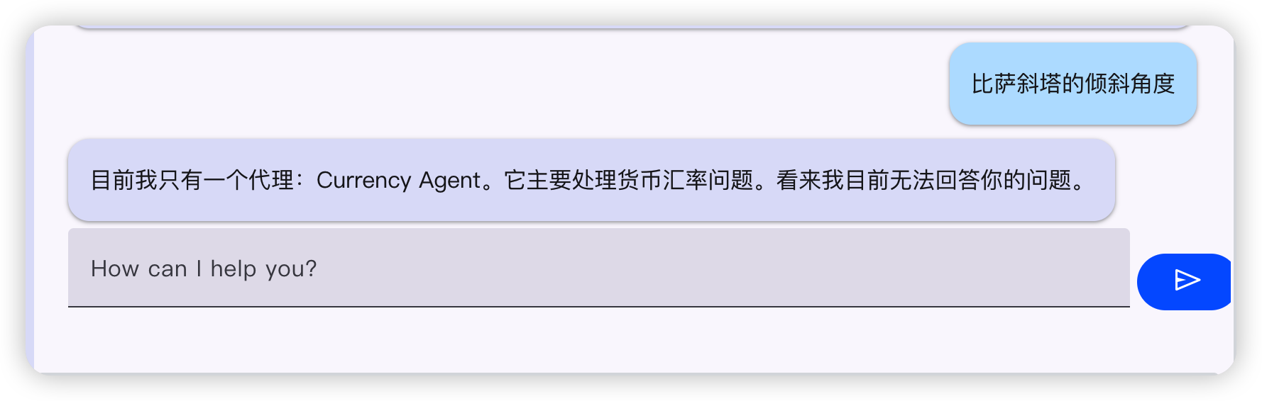 如果你加了一个汇率换算的 Agent,对话时,提示信息也会不一样。AI 会告诉我们只有一个 Currency Agent,无法回答比萨斜塔的倾斜角度问题。