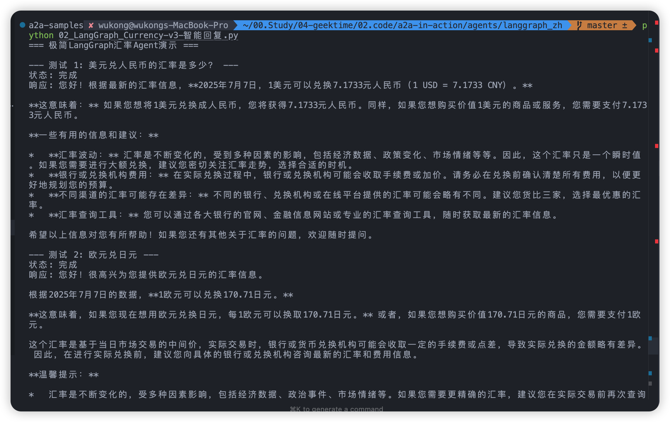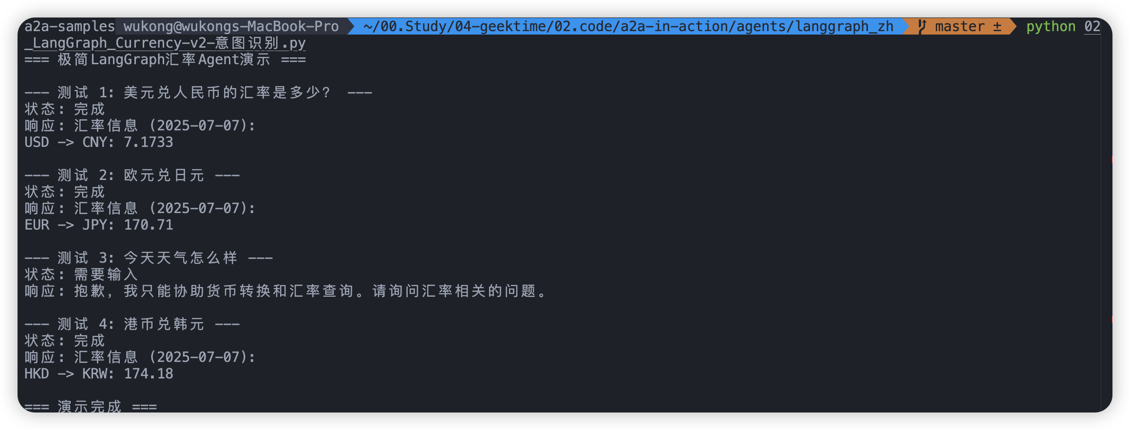 此示例演示了一个使用LangGraph构建并通过A2A协议暴露的货币转换Agent。它展示了支持多轮对话和流式响应的对话交互。