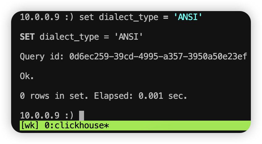 2、由于TPC-DS定义的查询语法为标准 SQL,设置数据库会话的方言类型为 ANSI:
