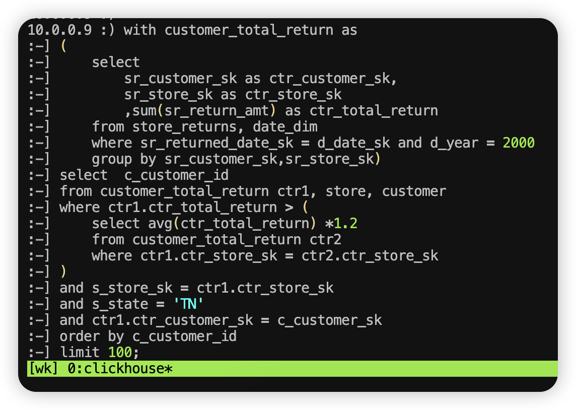 3、选择 TPC-DS 的 99 个查询中某个SQL执行,SQL 列表见 https://github.com/ByConity/byconity-tpcds/tree/main/sql/standard。