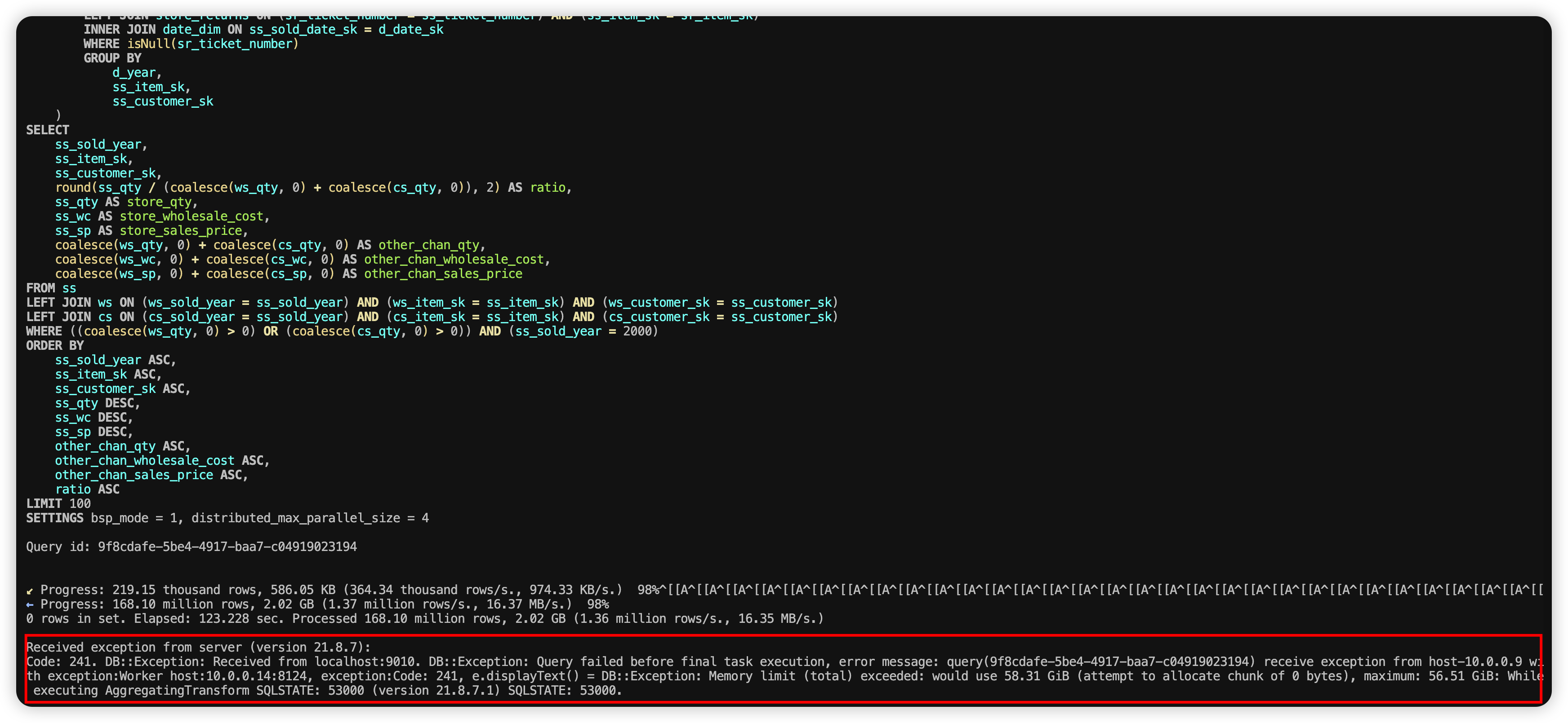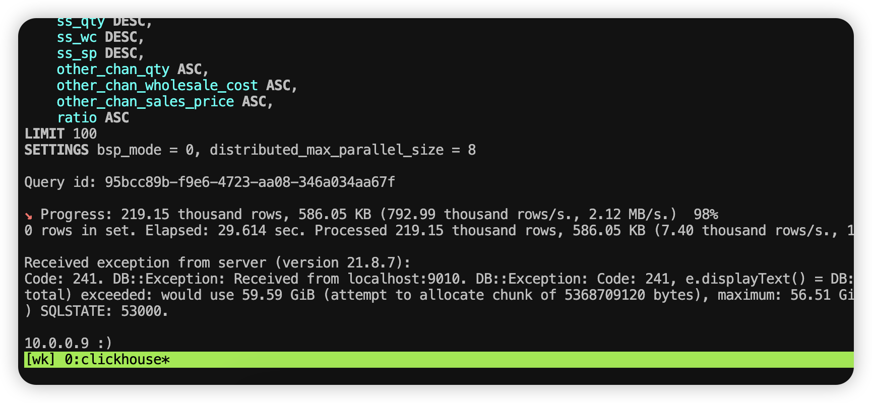 max_memory_usage = 9640000000,执行成功,如下图所示: