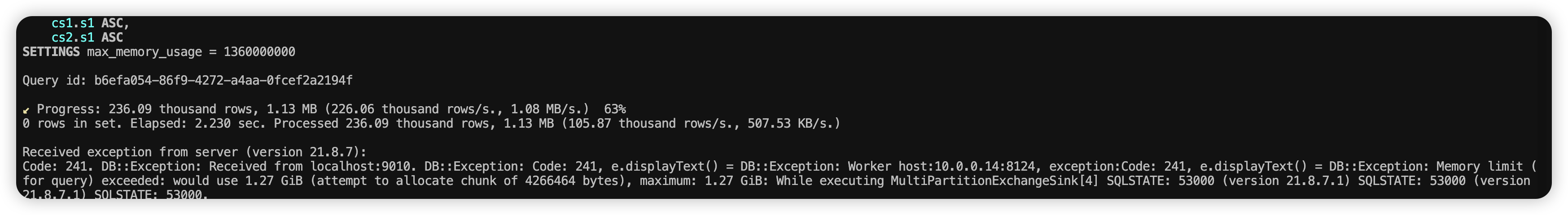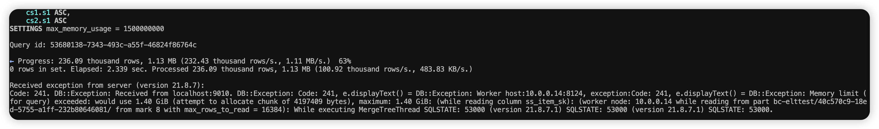当配置 max_memory_usage = 1134140000,执行失败,会引发 OOM。如下图所示:
