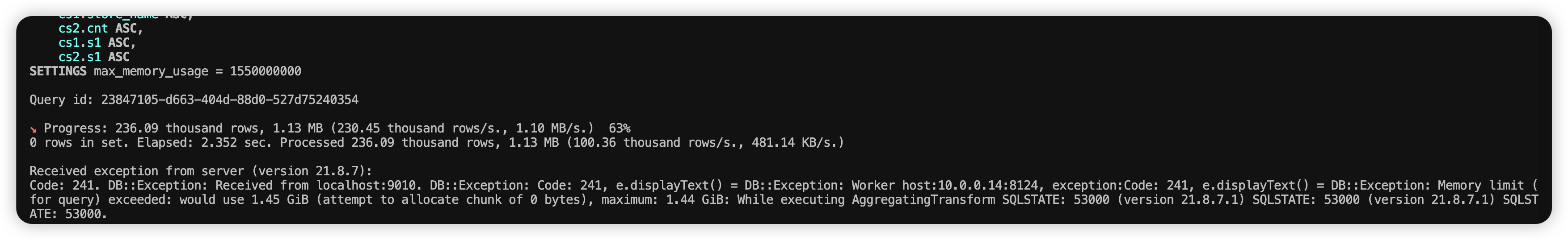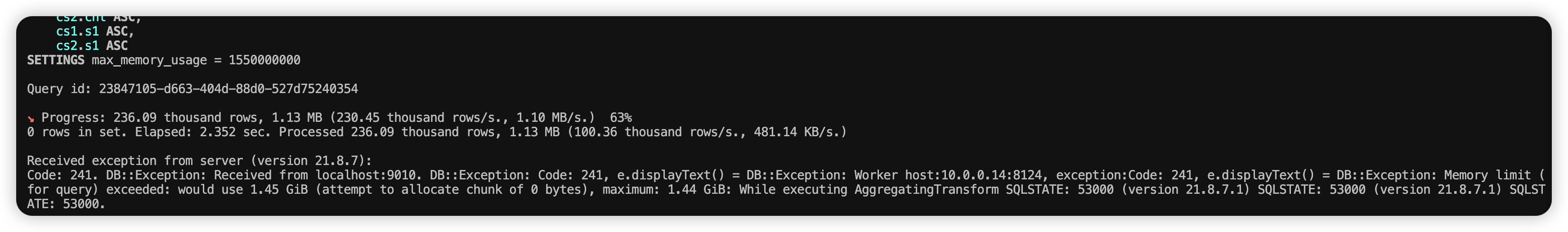 max_memory_usage = 1550000000,查询还是 OOM 了。