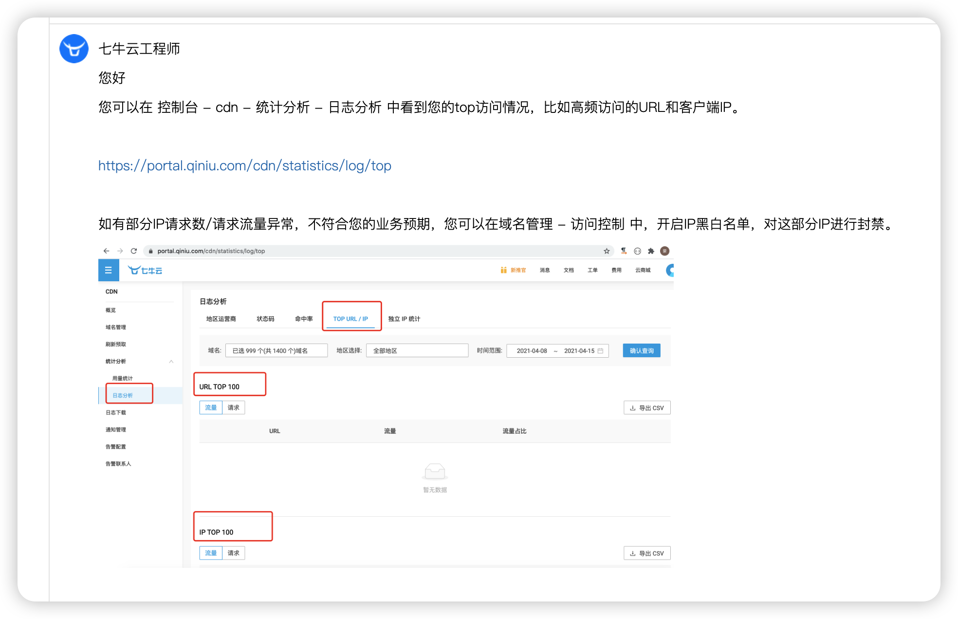 迅速建了个工单,找七牛云的工程师看看怎么整。