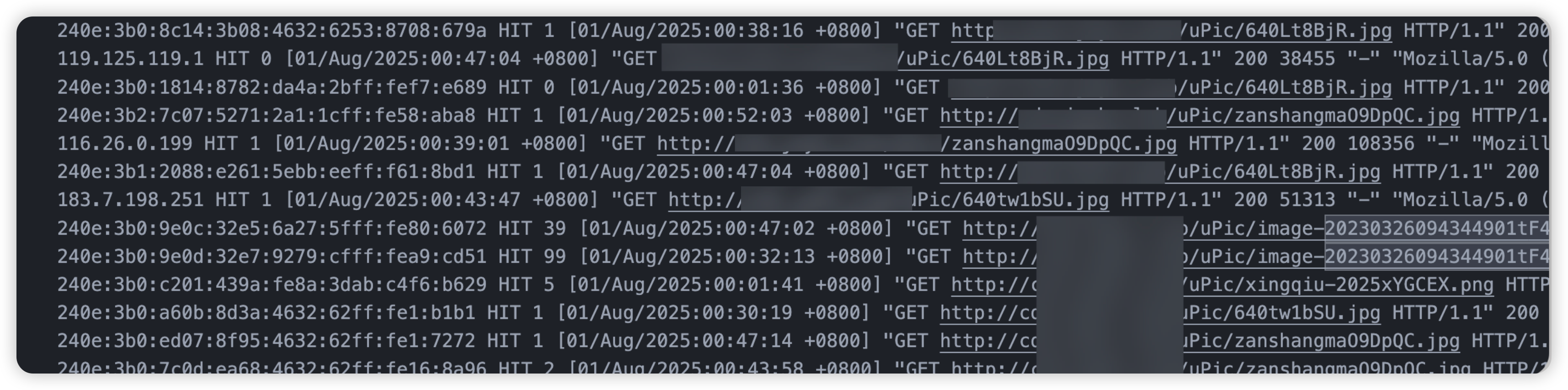 查看了访问日志,就是一大堆肉鸡服务器不断地访问网站的 5 张图片,造成了大量 CDN 流量,因为按量付费,所以超了很多钱。如下图所示,访问日志中可以看到很多不同的 IP,持续访问网站的图片。