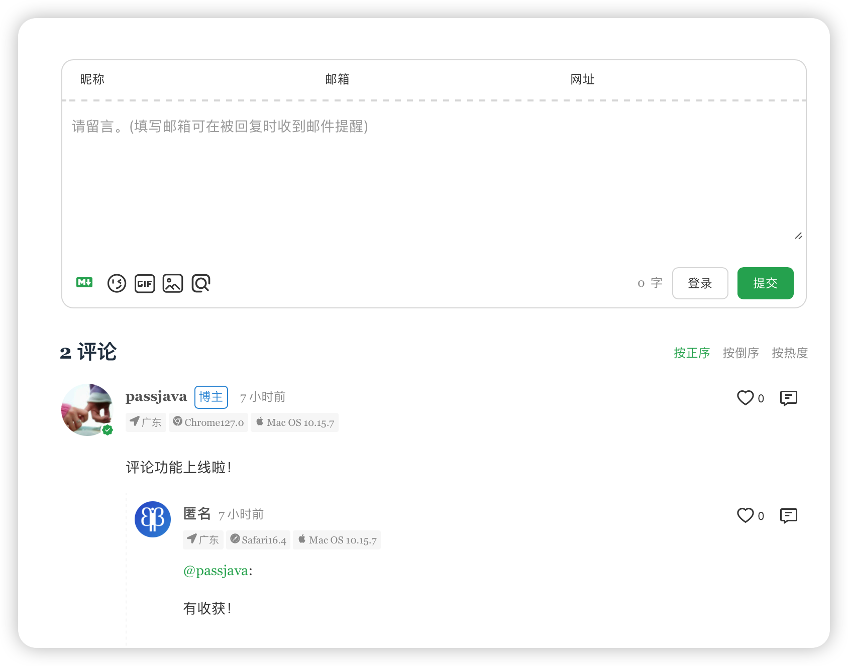 - 用户也可通过评论框注册账号,登陆后会跳转到自己的档案页。