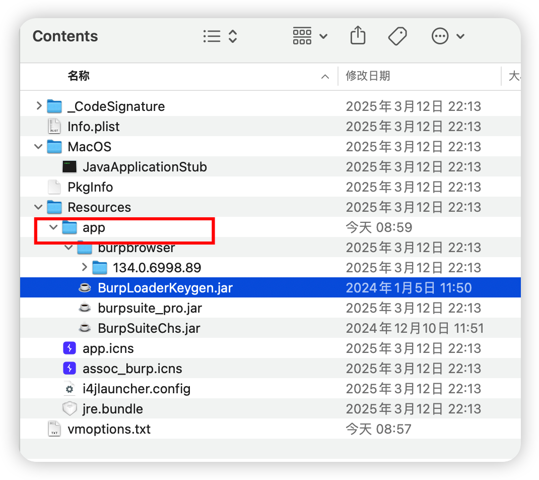 - 在应用程序中找到burp,显示包内容,依次打开文件夹:./Contents/java/app(如果没有的话就是./Contents/Resources/app),然后就会看到我们熟悉的jar文件了