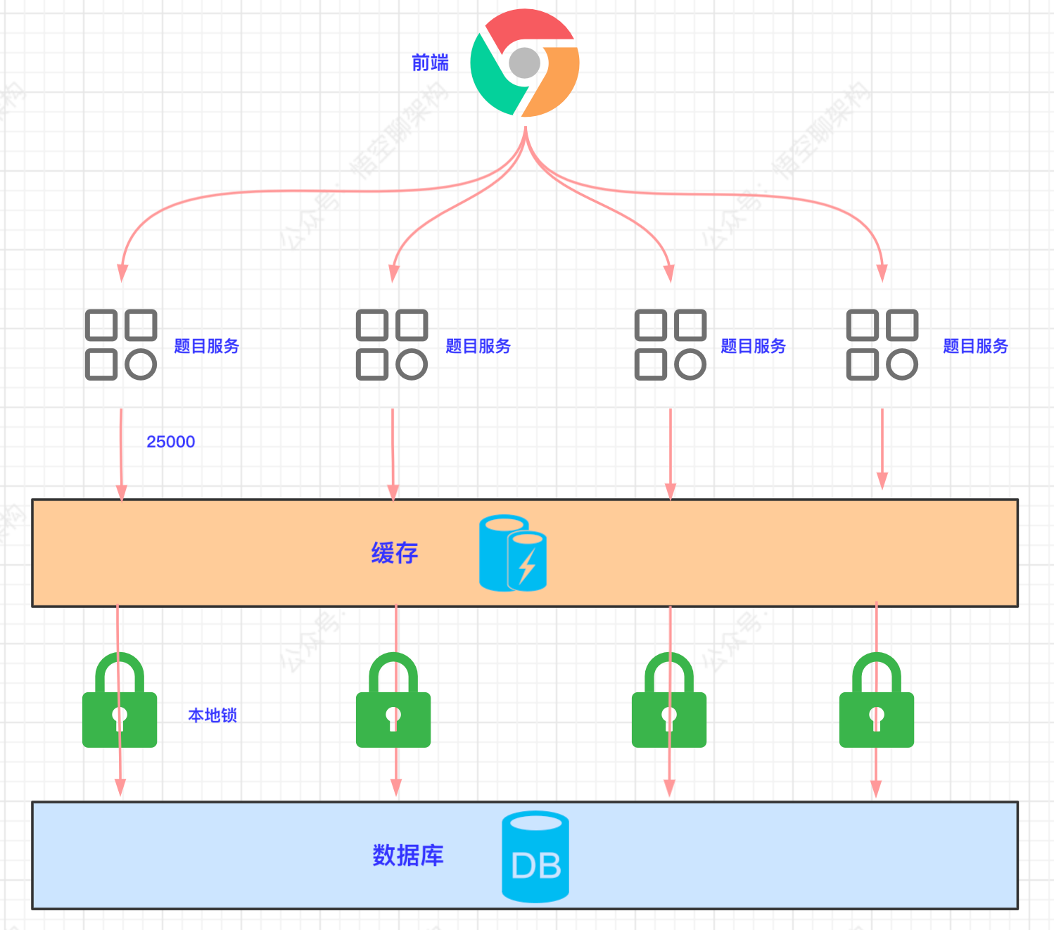 目前题目微服务被拆分成了四个微服务。前端请求进来时,会被转发到不同的微服务。假如前端接收了 10 W 个请求,每个微服务接收 2.5 W 个请求,假如缓存失效了,每个微服务在访问数据库时加锁,通过锁(synchronzied 或 lock)来锁住自己的线程资源,从而防止缓存击穿。