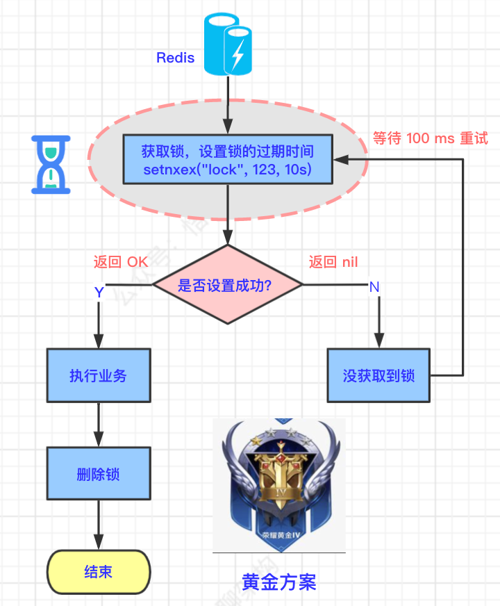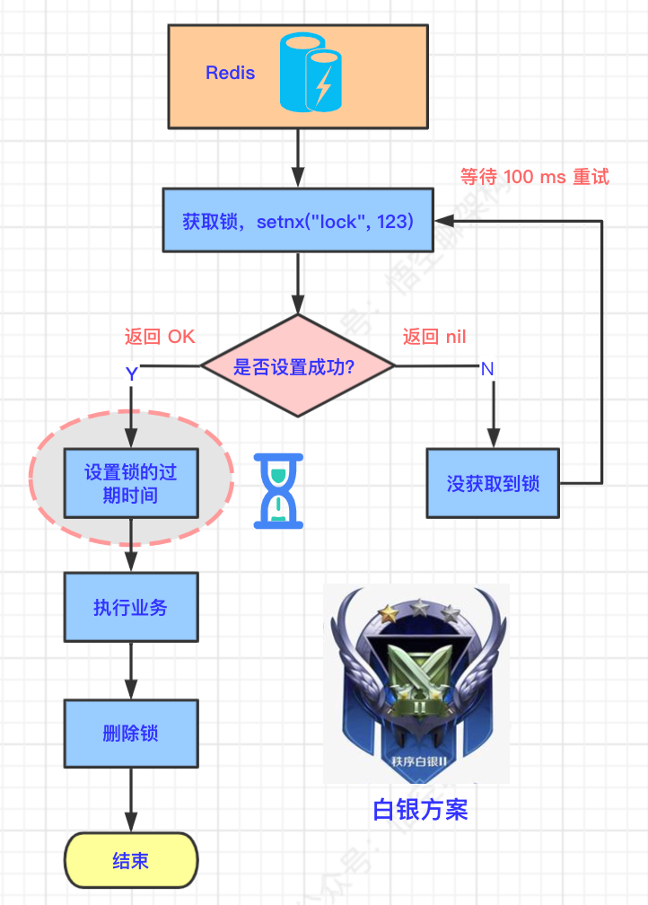 和青铜方案不同的地方在于,在占锁成功后,设置锁的过期时间,这两步是分步执行的。如下图所示: