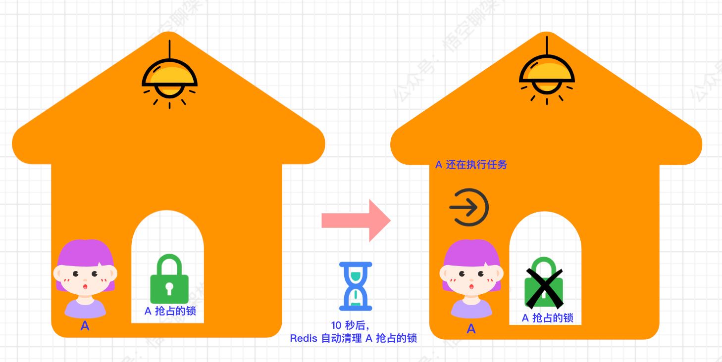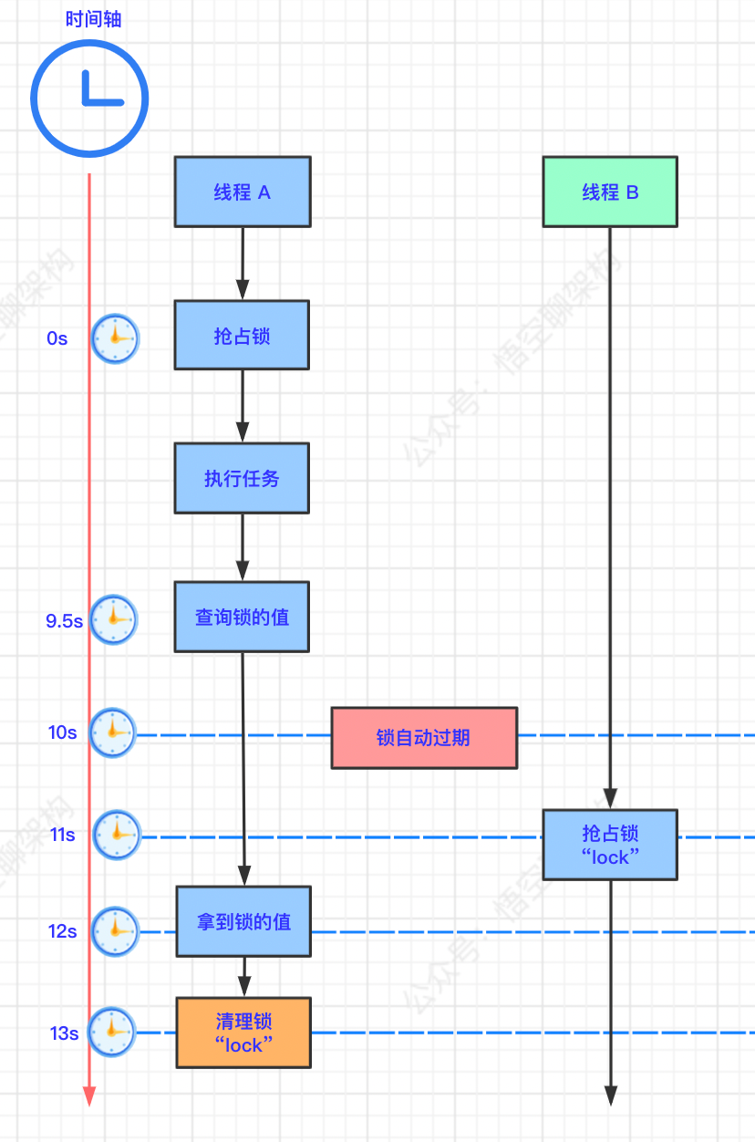 时刻:13s。线程 A 还是拿自己设置的锁的值和返回的值进行比较,值是相等的,清理锁,但是这个锁其实是线程 B 抢占的锁。