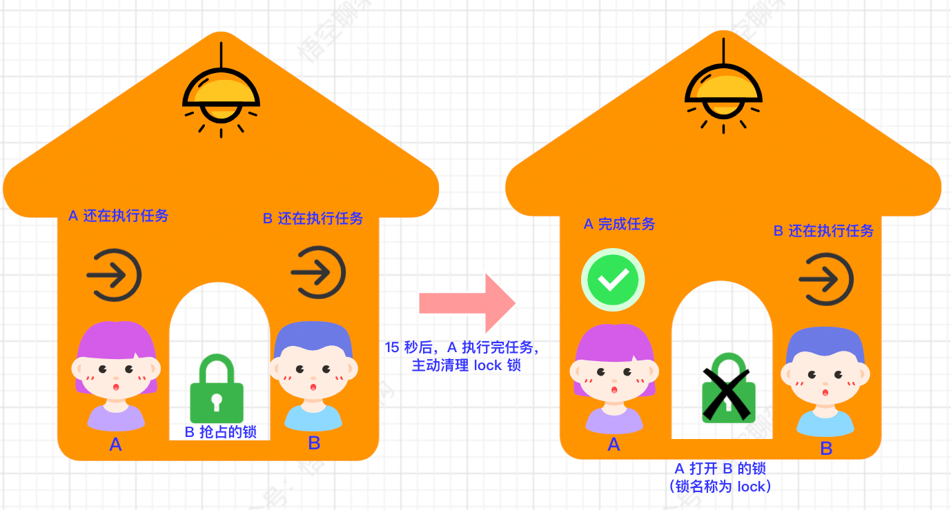 从上面的案例中我们可以知道,因为用户 A 处理任务所需要的时间大于锁自动清理(开锁)的时间,所以在自动开锁后,又有其他用户抢占到了锁。当用户 A 完成任务后,会把其他用户抢占到的锁给主动打开。