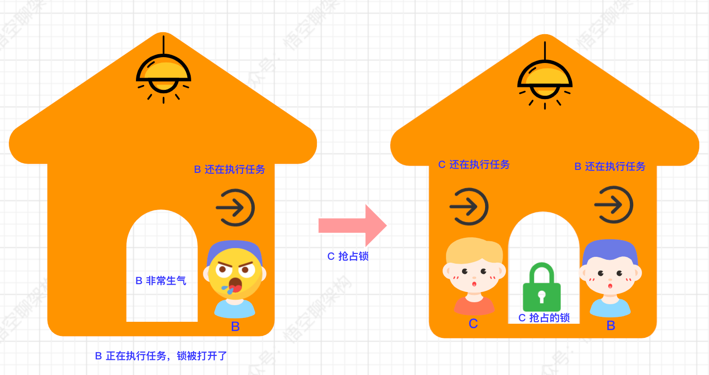 - 用户 B 非常生气:我还没执行完任务呢,锁怎么开了?