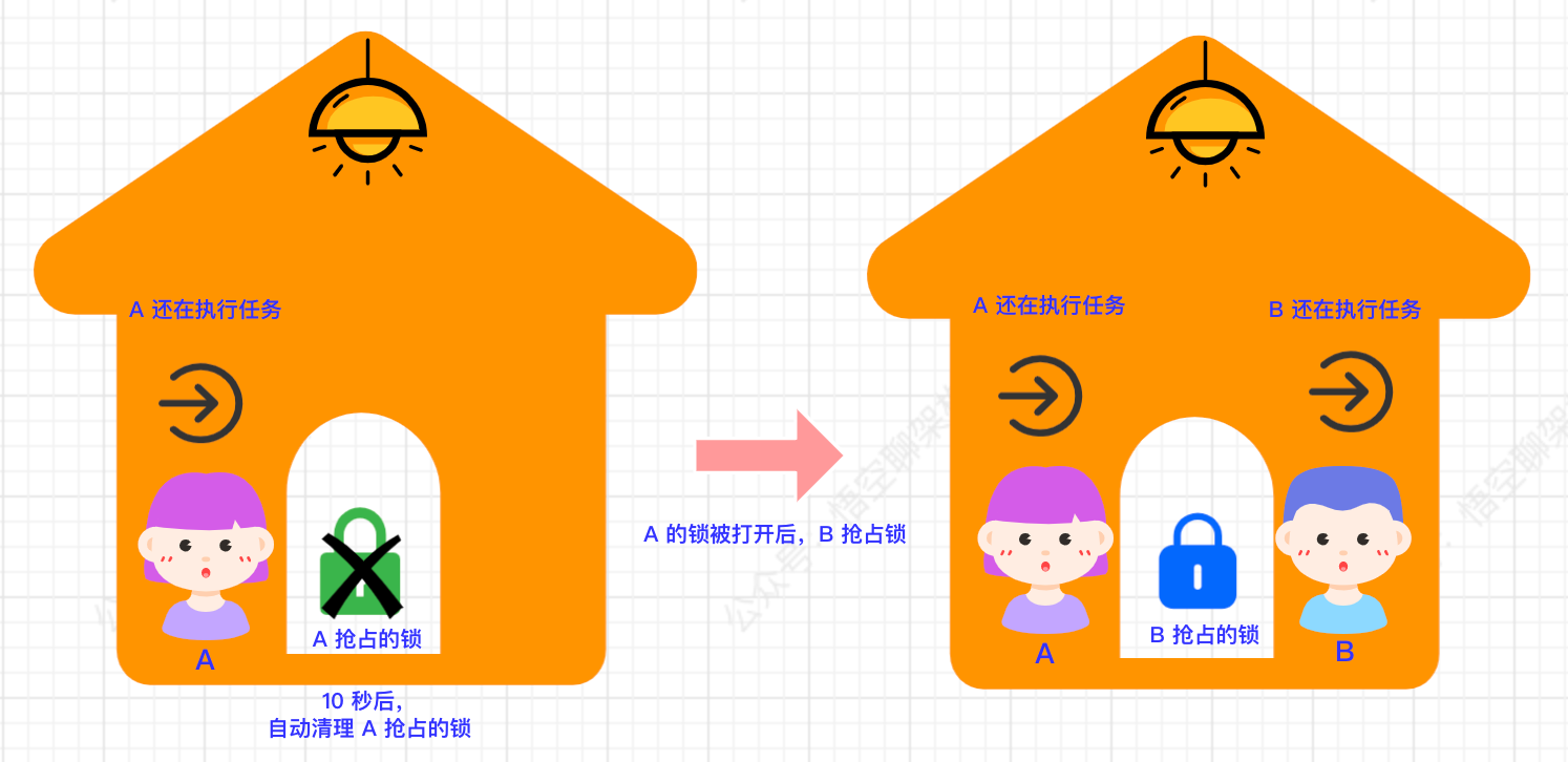 如下图所示,B 抢占的锁是蓝色的,和 A 抢占到绿色锁不一样。这样就不会被 A 打开了。