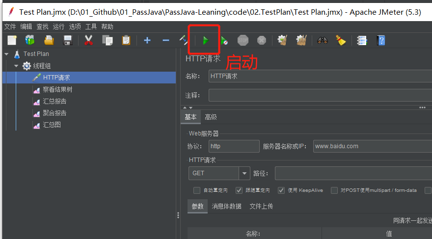 点击播放按钮就开始启动了。注意启动之前需要先设置线程组的参数配置和 HTTP 请求的配置。