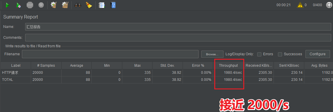 可以看下执行结果,吞吐量在 2422 个每秒,还是比较高的。