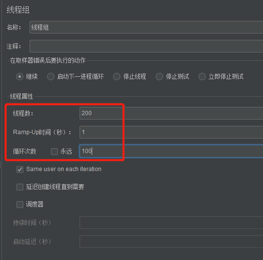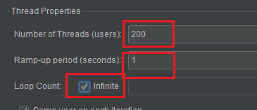 配置每秒发送 200 个请求,一直循环执行,直到手动停止压测。如下图所示: