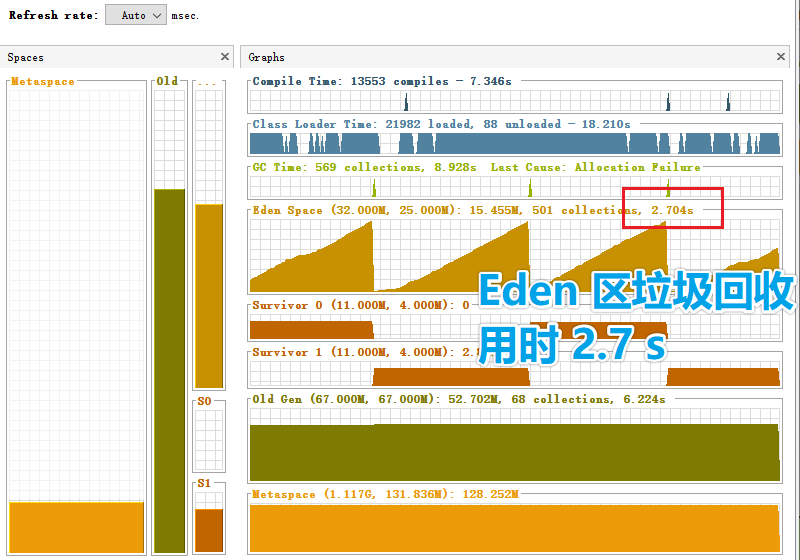 我们再来看看垃圾回收的情况,Eden 区垃圾回收用时 2.7 s,用时太长了吧,看看这里怎么能优化下。