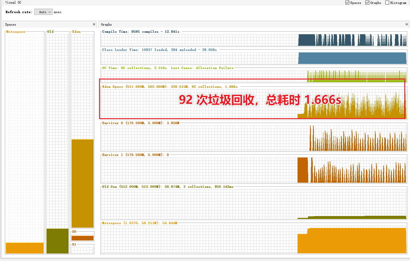 我们可以通过 jvisulavm工具查看垃圾回收的情况,Eden 区频繁发生 GC,短时间(1分钟)内共造成了 480 次 stop the world。另外从压测工具中也可以看到,吞吐量为 275/s。