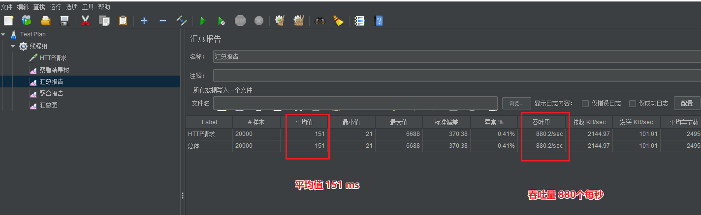 200 个线程,每个线程调用 100 次,总共 2 w 次,可以看到下图中表格中的样本列也是 2 w,请求所耗费的时间是 151 ms,吞吐量是 880 个请求每秒。