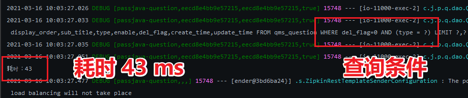 然后重启 passjava-question 服务,再次测试这个 api,耗时 43 ms